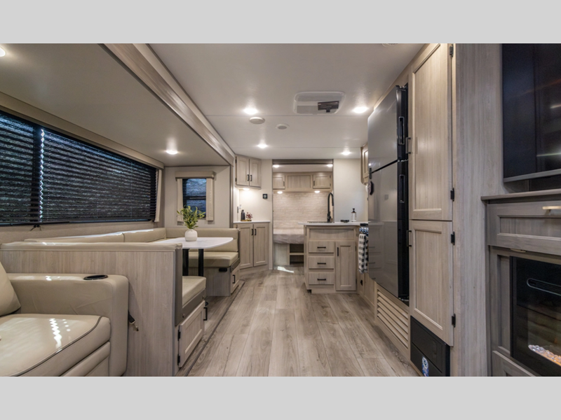 Sleeps 5 Slides 1 Length 33 ft 2 in Ext Width 8 ft Ext Height 11 ft 1 in Int Height 6 ft 9 in Hitch Weight 962 lbs GVWR 8736 lbs Dry Weight 7236 lbs Cargo Capacity 1500 lbs Fresh Water Capacity 38 gals Grey Water Capacity 74 gals Black Water Capacity 28 gals Furnace BTU 30000 btu Available Beds Queen Refrigerator Type GE Stainless 12V Refrigerator Size 10.7 cu ft Cooktop Burners 3 Shower Size 36" x 30" Number of Awnings 1 LP Tank Capacity 20 lbs Water Heater Type Tankless On Demand AC BTU 13500 btu Awning Info 21' Electric w/Multicolor LED Strip & Remote Axle Count 2 Number of LP Tanks 2 Shower Type Standard Electrical Service 30 amp Similar Floorplans