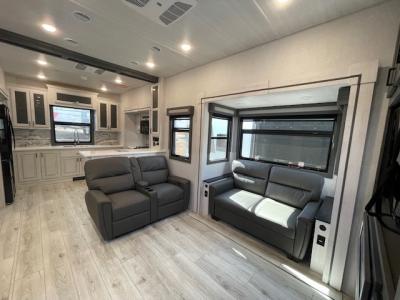 The spacious rear kitchen is equipped with a 30” microwave, 24” residential oven, overhead cabinets, breakfast bar with bar stools, walk-in pantry, and 16 cu. ft. refrigerator, perfect for cooking all your favorite dishes with the greatest convenience The living room is the heart of the home, featuring a desk with chairs, theater seating, two 60” trifold sofas, a TV with fireplace, and more. And when nature calls, you'll appreciate the convenient half bath with overhead cabinets and washer and dryer prep. The main bedroom is a serene retreat, featuring a king bed, drawers under the bed, a bedroom fireplace, and more. This is the perfect place to relax and recharge after a long day of adventure, and with a front full bathroom featuring a 30” x 40” shower, dual sink vanity, walk-in closet, dresser/drawers, you'll have everything you need to stay clean and comfortable on the go. Outside, you'll find not one, but two awnings to providing plenty of shade and protection from the elements.